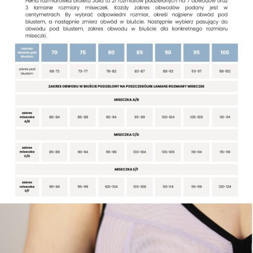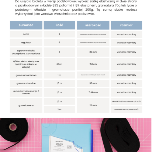 Poniżej zostały przygotowane szczegółowe informacje dotyczące braletu Julia. Można przejrzeć w postaci flipbooka częściową zawartość podręcznika do wykroju, która pokazuje w jaki sposób zostały przygotowane instrukcje dla użytkownika wykroju. Tabela rozmiarów oraz tabela zużycia potrzebnych materiałów zostały umieszczone w galerii zdjęć produktu. Dzięki tabelom można określić możliwość dopasowania rozmiaru z wykroju oraz ustalić listę zakupów przed przystąpieniem do szycia braletu.