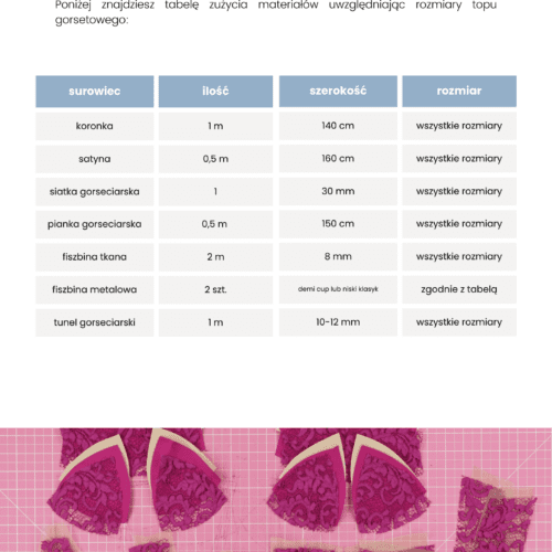 Poniżej zostały przygotowane szczegółowe informacje dotyczące topu gorsetowego Sara. Można przejrzeć w postaci flipbooka częściową zawartość podręcznika do wykroju, która pokazuje w jaki sposób zostały przygotowane instrukcje dla użytkownika wykroju. Tabela rozmiarów oraz tabela zużycia potrzebnych materiałów zostały umieszczone w galerii zdjęć produktu. Dzięki tabelom można określić możliwość dopasowania rozmiaru z wykroju oraz ustalić listę zakupów przed przystąpieniem do szycia topu.