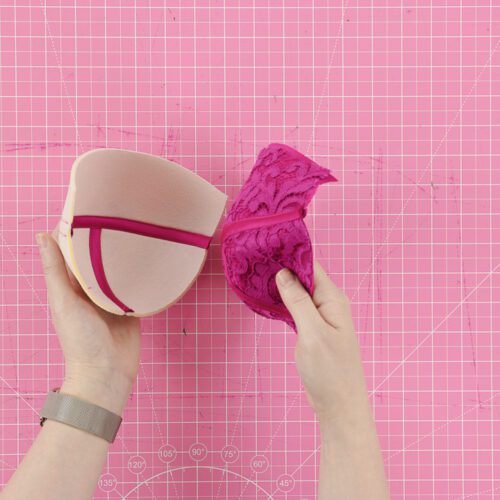 Takim przykładem może być ozdobny pasek do wykończenia kołyski po wszyciu miseczki od prawej strony topu. Jest to najtrudniejszy element i możesz z niego zrezygnować. Wystarczy, że po wszyciu tunelu gorseciarskiego, przeszyjesz po wierzchu kołyskę, łapiąc tunel na metalową fiszbinę od lewej strony.